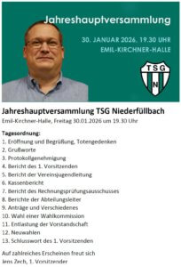 TSG-Jahreshauptversammlung Wann 30. Jan. 2026 19:30 - 22:00 Zum Kalender hinzufügen ICS herunterladen Google Kalender iCalendar Office 365 Outlook Live Wo Emil-Kirchner-Halle Schloßstr. 13, Niederfüllbach, 96489
